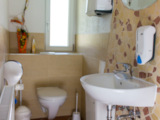 Mit im Zimmer integriert ist eine Dusche, ein Waschtisch sowie ein Schreibtisch mit Stuhl. Das WC befindet sich schräg gegenüber auf dem Gang.