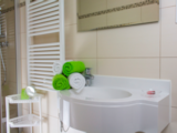 Ein komfortables und modern eingerichtetes Bad mit geräumiger Dusche, einem Haarfön und Kosmetikspiegel sowie ein kleines